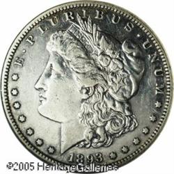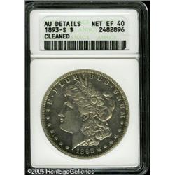 <B>1893-S<img border='0' src='http://www.heritagecoins.com/images/star.gif' width=10 height=10>$1 --Cleaned--ANACS. AU Details, Net XF40.</B></I> The surfaces are very bright and just on the borderline of cleaned and polished. The devices are outlined in darker patina with slight friction noted over the highpoints of the design. Lot:10431
