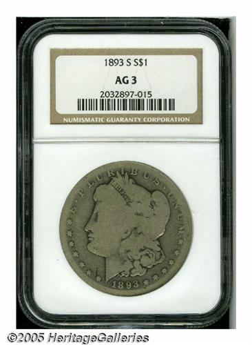 <B>1893-S<S$1> AG3 NGC.</B></I> Portions of the peripheral legends on the reverse are worn into the rim, although the date and mintmark are clear. A few minor marks are noted over each side.