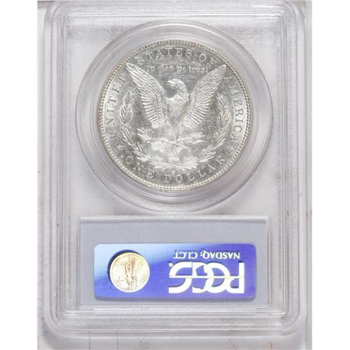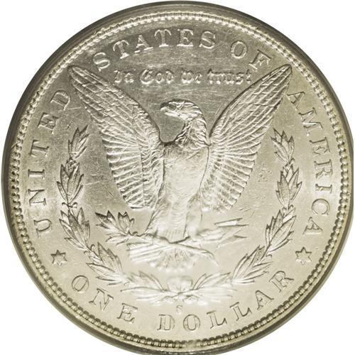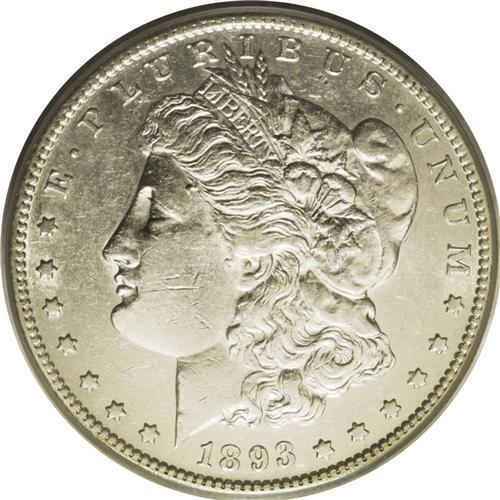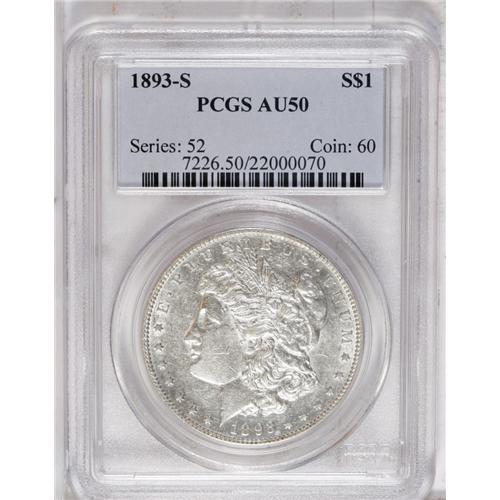 <B>1893-S<img border='0' src='http://www.heritagecoins.com/images/star.gif' width=10 height=10>$1> AU50 PCGS.</B></I> Remnants of satiny luster adhere to both sides of this About Uncirculated representative. The surfaces are essentially untoned with a few scattered abrasions. A couple of small milling marks are visible on Liberty's cheek. The only outwardly noticeable wear is over the central highpoints, but the overall definition is solid for the AU grade level. One of just 100,000 coins produced, and highly desirable as a key date Morgan dollar.