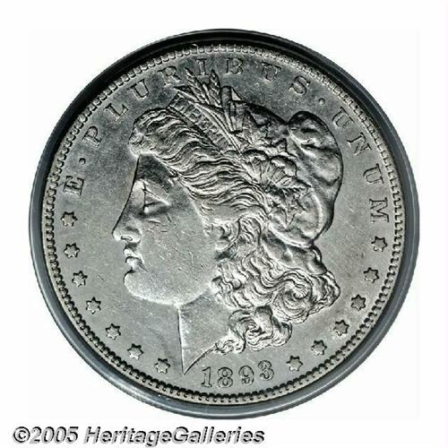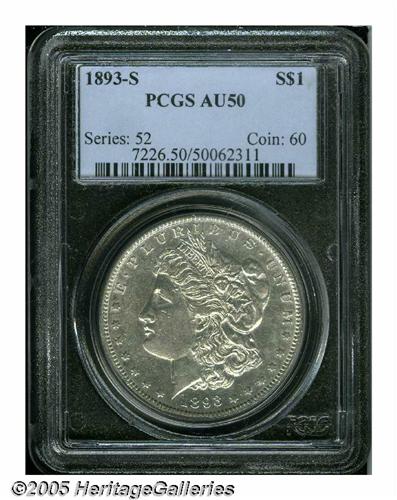 <B>1893-S<S$1> AU50 PCGS.</B></I> Where else but a Heritage Signature sale can the collector choose from at least eight different grades of this ever-popular scarcity? The surfaces on this partially lustrous example exhibit a uniform silver-gray color and only minor flatness on the highpoints from a rather brief time in circulation. There are relatively few surface marks, none of which are of individual concern.