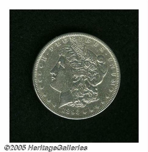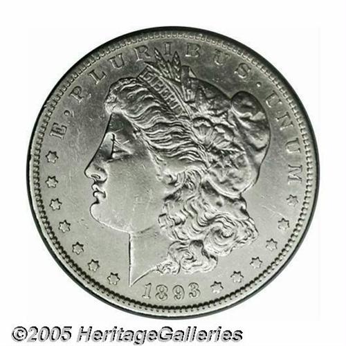 <B>1893-S<S$1> AU50 Reverse Damaged, Cleaned, Uncertified.</B></I> An untoned, over-dipped example of this important key date. Only light wear is present above Liberty's ear and on the eagle's breast. The reverse has numerous pinprick marks, presumably made long ago by someone who did not know (or care) that only 100,000 pieces were struck.