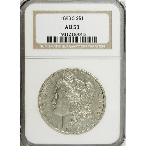 <B>1893-S S$1 AU53 NGC.</B></I> The 1893-S is one of the most desirable and popular issues in the Morgan dollar series. David Bowers, in his 2005 second edition <I>Guide Book of Morgan Silver Dollars,</B></I> makes some interesting comments about this important key date: "The majority of known pieces, into the thousands, are in the single grade category of Very Fine. Not G or VG, not EF or AU, but VF. Most such pieces circulated in the American West, and for an appropriate but apparently restricted time, to bring them to this grade. Mint State coins exist. However, among the great Treasury release coins of 1962 through 1964, no bag or even small group was found, although many stray pieces were identified, nearly all in the aforementioned VF grade."<BR> The collector who desires to acquire a high-grade 1893-S for her/his collection will want to give serious consideration to the AU53 example in this lot. As Bowers implied above, Mint State specimens are not seen in quantity. NGC and PCGS combined have graded fewer than 60 Uncirculated coins, and a number of them are likely resubmissions (3/07). This specimen contains a fair amount of luster in the recessed areas, and is essentially untoned. Sharp definition is apparent on the design elements, though light wear is visible in portions of Liberty's hair and on the eagle's breast. A few wispy circulation marks on each side do not detract.<BR><BR><b>Shipping:</b> Coins & Currency (<a target="_blank" href="http://www.heritageauctions.com/common/shipping.php">view shipping information</a>)