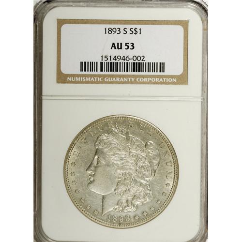 <B>1893-S S$1 AU53 NGC.</B></I> The 1893-S issue is one that seems to enjoy unceasing popularity with collectors, and the considerable price appreciation that the date has seen in the last three years or so shows little sign of abating. This is also one issue that the uninitiated should <I>never</B></I> buy "raw" or uncertified, as numerous, perhaps thousands, of spurious examples exist. The present NGC-certified piece offers pleasing lustrous silver surfaces with no appreciable toning. The eye appeal is excellent, and Liberty's cheek is extremely clean, despite the light highpoint rub. Beautiful and distraction-free.<BR><BR><b>Shipping:</b> Coin/Currency (<a target="_blank" href="http://www.heritageauctions.com/common/shipping.php">view shipping information</a>)