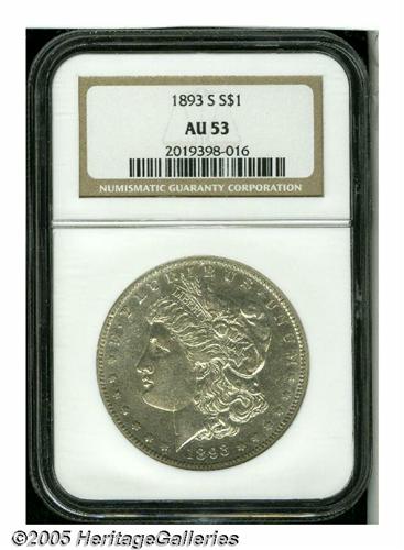<B>1893-S<S$1> AU53 NGC.</B></I> Where else but a Heritage Signature sale can the collector choose from multiple XF and AU examples (some being offered in the regular Silver Dollar section) of this ever-popular scarcity? This bright silver-gray example is partially lustrous and displays minimal wear on the highpoints. Marks on Liberty's upper lip and on the eagle's breast and leg show up under close scrutiny.