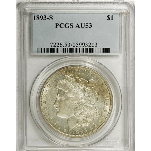 <B>1893-S S$1 AU53 PCGS.</B></I> A lightly circulated example of this key-date Morgan dollar, one of the finest circulated survivors from the skimpy mintage of an even 100,000 pieces at the San Francisco Mint in 1893. The Bowers silver dollar <I>Red Book</B></I> notes that the great majority of circulated pieces, "into the thousands," exists in the single circulated grade of Very Fine, indicating that most circulated in the West for an appropriate length of time to bring them to such a grade. This example is largely brilliant but shows a touch of golden cast on each side. Much luster remains, although rub shows on the highpoints of the cheek and eagle's breast. Population: 50 in 53, 68 finer (11/06).<BR><BR><b>Shipping:</b> Coin/Currency (<a target="_blank" href="http://www.heritageauctions.com/common/shipping.php">view shipping information</a>)