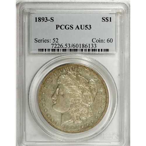 <B>1893-S S$1 AU53 PCGS.</B></I> Judging from PCGS and NGC population figures, this key-date Morgan dollar is available in grades VG through Choice XF with a little searching and some patience. The certified population, however, starts to decline in AU50, and even more so through Choice AU. The AU53 example offered in this lot exhibits bright silver surfaces that show only the barest hint of occasional tan-gold color under magnification. Considerable luster still resides in the recessed areas, and both sides are devoid of significant bagmarks. This coin will be a welcome addition to a high-grade set of Morgan dollars. Population: 50 in 53, 68 finer (11/06).<BR><BR><b>Shipping:</b> Coin/Currency (<a target="_blank" href="http://www.heritageauctions.com/common/shipping.php">view shipping information</a>)