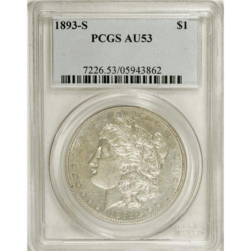 <B>1893-S S$1 AU53 PCGS.</B></I> The classic key-date in the Morgan dollar series, this example exhibits only light wear on the high points, and presents lovely light silvery-gray surfaces. The fields retain nearly full luster and considerable prooflike surface remains visible in the protected areas. In fact, this piece was probably a remarkable fully prooflike example when it was struck, and an argument can be made to call it a prooflike piece today, despite a little evidence of circulation. Only one coin has ever received the Prooflike designation from PCGS, and only 67 coins have been certified by PCGS at a higher grade level than this example, an incredibly low population for any Morgan dollar.<BR><BR><b>Shipping:</b> Coins & Currency (<a target="_blank" href="http://www.heritageauctions.com/common/shipping.php">view shipping information</a>)
