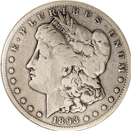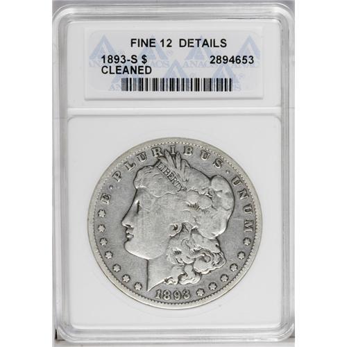 <B>1893-S<img border='0' src='http://www.heritagecoins.com/images/star.gif' width=10 height=10>$1>--Cleaned--ANACS. Fine 12 Details.</B></I> The years from 1893 to 1895 are full of elusive issues, and the 1893-S is no exception. In fact, at 100,000 pieces coined, it has the lowest mintage of any business strike issue of the series. The moderately worn bright gray surfaces are unnaturally glossy. An important piece, nonetheless, for the dedicated collector of this popular series.<BR><I>From The Catfish Creek Collection, Part Two.</B></I>