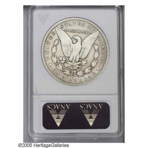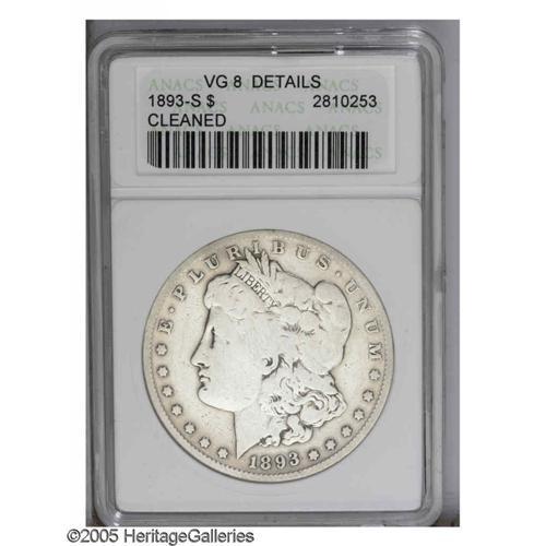 <B>1893-S<S$1>--Cleaned--ANACS. VG8 Details.</B></I> A polished example of this famous key date Morgan Dollar. Bright and glossy but the date, mintmark, and LIBERTY are clear, and some hair and plumage detail remain. The borders offer light honey toning.