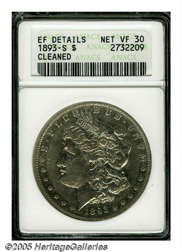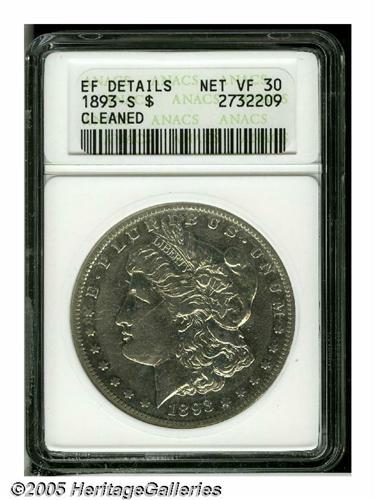 <B>1893-S<S$1>--Cleaned--ANACS. XF Details, Net VF30.</B></I> The resulting brightness on this modestly worn silver-gray example is unnatural to be sure, but would not be offensive to a great number of Morgan Dollar collectors. Interest in these key issues appears to be at an all-time high.