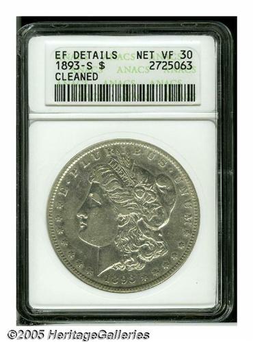 <B>1893-S<S$1>--Cleaned--ANACS. XF Details, Net VF30.</B></I> Both sides of this always-popular Morgan Dollar key are relatively unmarked with a subdued silver-gray appearance from a past cleaning. Desirable in all grades, and almost invariably one of the final issues to be secured for a complete set of this widely collected series.