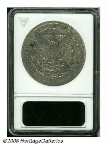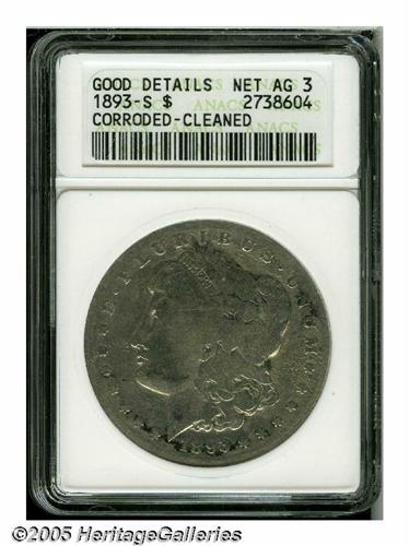 <B>1893-S<S$1>--Corroded, Cleaned--ANACS. Good Details, Net AG3.</B></I> Light gray surfaces with moderate corrosion on both sides. A hole filler for the date.