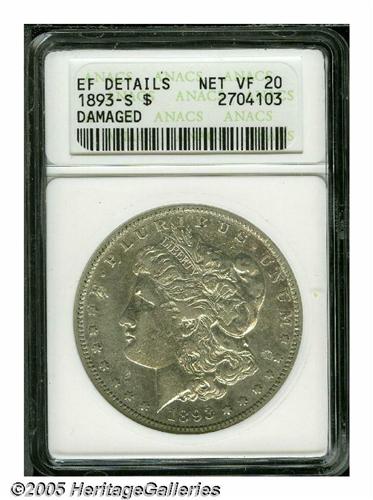 <B>1893-S<S$1>--Damaged--ANACS. XF Details, Net VF20.</B></I> A couple of small indentions are seen in the right fields on each side. Otherwise, a light silver-gray example with nominal wear overall.
