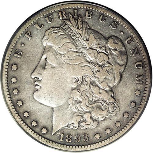 <B>1893-S<img border='0' src='http://www.heritagecoins.com/images/star.gif' width=10 height=10>$1> Fine 12 ANACS.</B></I> A pleasing middle circulated grade example with smooth pewter-gray surfaces and lighter tan color on the devices. The surfaces are pleasing and exhibit only the usually encountered light circulation marks. Like most key-date issues in all different series, demand for this date has risen dramatically in the past couple years.