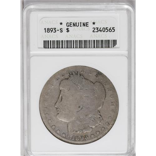 <B>1893-S<img border='0' src='http://www.heritagecoins.com/images/star.gif' width=10 height=10>$1>--Genuine--ANACS.</B></I> ANACS has not designated a grade, but we consider this lavender-gray key date dollar to grade AG3. The reverse peripheral legends are partly worn into the rim. The obverse legends are well worn but fully legible. The mintmark is filled but its shape is unmistakable.