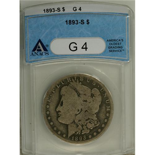 <B>1893-S S$1 Good 4 ANACS.</B></I> All legends are readable on this circulated key date dollar, and only the tops of a couple of letters in PLURIBUS and UNITED meet the rim. The date and mintmark are distinct. A couple of light marks near the CA in AMERICA are noted, although there are fewer abrasions overall than expected for the grade.<BR><BR><b>Shipping:</b> Coin/Currency (<a target="_blank" href="http://www.heritageauctions.com/common/shipping.php">view shipping information</a>)
