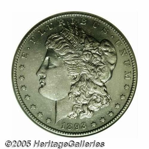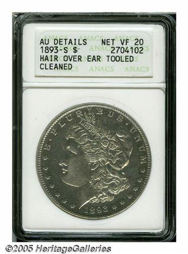 <B>1893-S<S$1>--Hair Over Ear Tooled, Cleaned--ANACS. AU Details, Net VF20.</B></I> A glossy and slightly bright cream-gray example of this difficult key date Morgan Dollar issue. The hair detail over Liberty's ear has been amateurish reengraved.