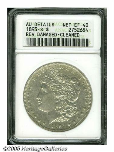 <B>1893-S<S$1>--Reverse Damaged, Cleaned--ANACS. AU Details, Net XF40.</B></I> Bright silvery surfaces display light, wispy hairlines, and a few minute contact marks scattered about, especially on the obverse. Numerous tiny punch marks are evenly scattered over the reverse.