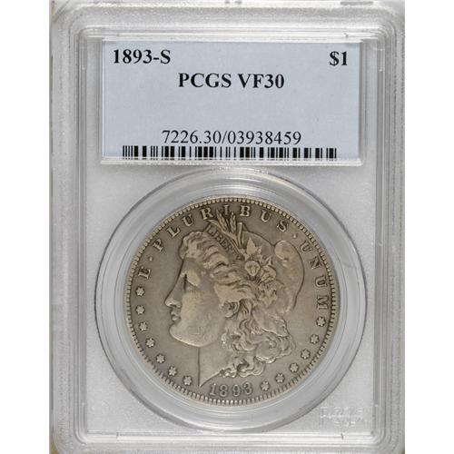 <B>1893-S S$1 VF30 PCGS.</B></I> Unlike a number of issues in this series, the 1893-S saw considerable circulation, and a survey of pieces offered by Heritage in the past reveals grades from AG3 to Gem. This is a visually appealing example with a moderate amount of honest wear. The cheek has a handful of light abrasions, none particularly distracting, and the surfaces are largely rose-gray with cream-gray highpoints. An excellent piece that would make a fine cornerstone for a collection of similarly graded Morgan dollars.<BR><BR><b>Shipping:</b> Coins & Currency (<a target="_blank" href="http://www.heritageauctions.com/common/shipping.php">view shipping information</a>)