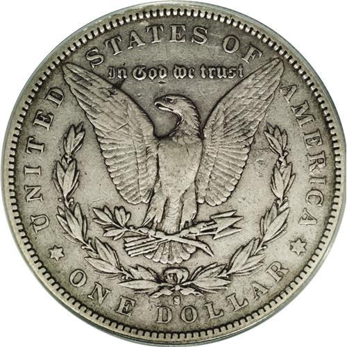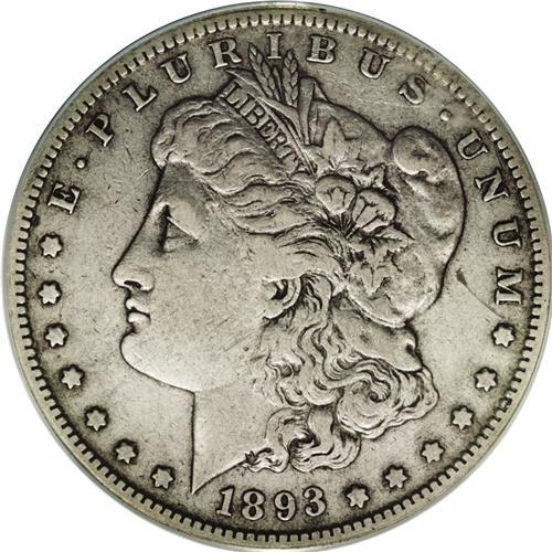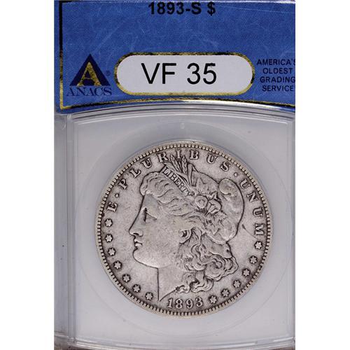 <B>1893-S<img border='0' src='http://www.heritagecoins.com/images/star.gif' width=10 height=10>$1> VF35 ANACS.</B></I> This key date Morgan dollar displays pleasing light gray, semi-bright surfaces. The design elements are nicely defined, though the hair over Liberty's ear and the eagle's breast reveal some flatness. The singular, noticeable blemish is a shallow scrape in the field between Liberty's cap and the M in UNUM. A few lighter marks occur on Liberty's lower cheek. All in all, this example will fit nicely in most mid-grade Morgan sets.