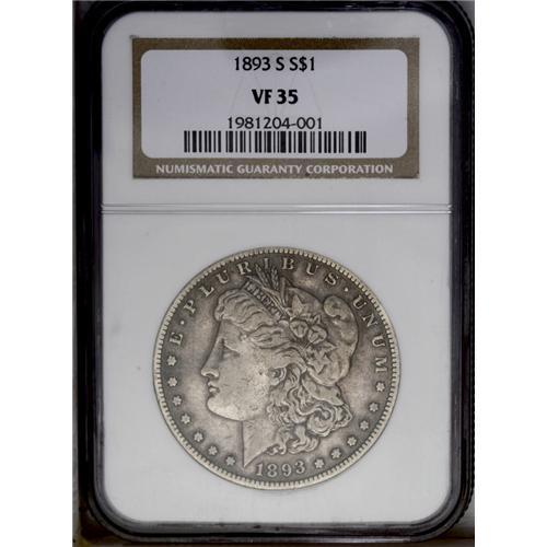 <B>1893-S<img border='0' src='http://www.heritagecoins.com/images/star.gif' width=10 height=10>$1> VF35 NGC.</B></I> An issue that seems to increase weekly in the price guides, here represented by a medium gray example with a bit of buildup in the protected areas that confirms the originality. No visible distractions are present, just moderate, grade-consistent wear. <BR><BR><B>Important notice:</B> Heritage usually auctions material at the rate of 200-250 lots per hour. On some occasions eBay Live bid software or the Internet may not be able to keep up with the pace of the auction. We recommend placing a realistic absentee bid now as insurance to avoid disappointment. Occasionally the auctioneer may eliminate or reject an eBay Live bid, and the auctioneer may also reopen a lot after the close of the eBay live bidding (usually because we missed an audience bid), and may reject your bid even if it shows you as the winning bidder. By bidding via eBay Live, you agree that Heritage may award the lot to another bidder at its sole discretion under the circumstances described above or any other reasonable circumstances. Since eBay bids are not shown to us until we open the lot on the floor, we treat those bids just like floor bids. In most cases the floor responds before the eBay bid is presented to us, due to Internet lag time, so for consistency we have made it a policy that floor bids are always considered first over tie eBay live bids. Also please note that all Heritage lots purchased through eBay Live carry a 20% Buyer's Premium. Please make sure you read the Terms and Conditions before you bid. This lot is being auctioned in conjunction with a live floor auction by Heritage Galleries & Auctioneers. All final auction and invoice information will be supplied by Heritage Galleries & Auctioneers, and all other information should be considered preliminary. Lot:3642 <BR><BR><B>Winning Notification and Billing:</B> After the FINAL session in this auction is complete, Heritage will send e-mail and snail mail invoices. This process normally takes several days. All final auction and invoice information will be supplied by Heritage Galleries & Auctioneers, and all other information should be considered preliminary. <BR><BR>This auction will be conducted on a live auction floor and over the Internet through eBay Live. If you choose to place an absentee bid, please take a moment to <font color='#0000ff'><u><a href='http://pages.ebay.com/liveauctions/help/before/laabsentee.html'>learn how eBay Live absentee bidding works</a></u></font><font color='#000000'>