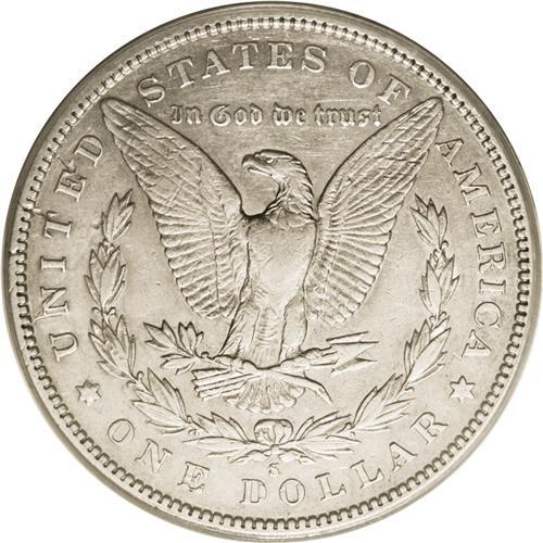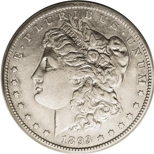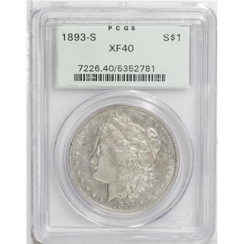 <B>1893-S<img border='0' src='http://www.heritagecoins.com/images/star.gif' width=10 height=10>$1> XF40 PCGS.</B></I> Authenticators zero in on two die diagnostics for the 1893-S, a minute die dot on the left foot of the R in LIBERTY, and a tiny die line near the peak of the upright of the neighboring T. Both those diagnostics are present on this example. Evaluation beneath a glass locates a couple of moderate marks on the left reverse border and on Liberty's jaw, but these are partly concealed by the creamy slate-gray toning. Luster emerges from recesses of the devices. The eagle's breast is worn, as is the eyebrow and the curl over the ear, but the remainder of the design is sharp. Many collectors have begun a holding of Morgan dollars, but comparatively few have managed to add the key date 1893-S. Certified in a green label holder.<BR><I>From The Tide Collection.</B></I>