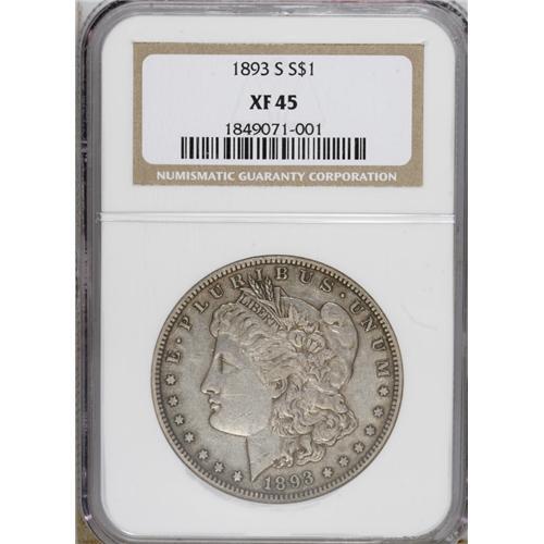 <B>1893-S S$1 XF45 NGC.</B></I> The 1893-S, with a mintage of 100,000 coins, has the lowest business strike production figure for Morgan dollars, except for the 1895 Philadelphia issue (of which 12,000 were struck, but of which no examples are known today). Moreover, David Bowers (1993) states that: "It may have been that tens of thousands ... were melted under terms of the 1918 Pittman Act." Still, many thousands were released into circulation. Because thousands of worn specimens survive, it is not an "impossible" rarity (David Bowers, 2006). About Uncirculated and Mint State pieces, of course, are considerably more difficult.<BR> The Choice XF coin in this lot displays semi-bright silver-gray surfaces that darken slightly in some of the recessed areas and in parts of the open reverse fields. Sharp detail is seen on most of the design elements, except for smoothness on some of Liberty's hair curls and on the eagle's breast. A couple of small marks occur on the cheek and neck, but in large part the surfaces are quite clean for a large, heavy coin that has seen some circulation. Overall, a nice key-date example.<BR><BR><b>Shipping:</b> Coins & Currency (<a target="_blank" href="http://www.heritageauctions.com/common/shipping.php">view shipping information</a>)
