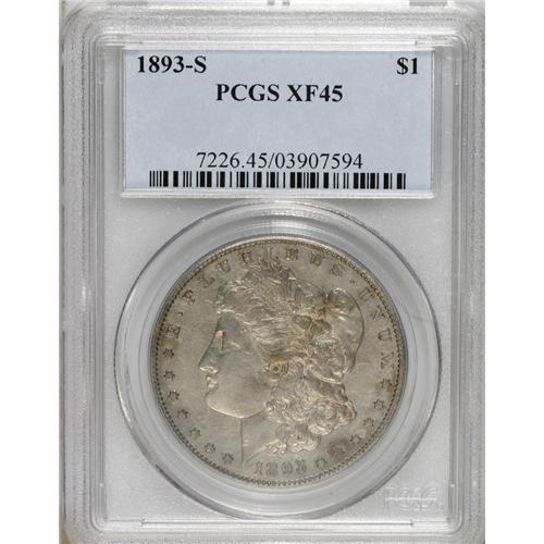 <B>1893-S S$1 XF45 PCGS.</B></I> The 1893-S is a coin that demonstrates a direct correlation between low mintage (100,000 pieces) and low availability. Always needed by collectors in all grades. We sometimes have a "grading set" of this rarity in major auctions, pieces that range from AG through lower Uncirculated condition. These pieces are always snapped up as the '93-S is the key to the series. This particular piece has smoky-gray patina over both sides with considerable underlying brightness. The striking details are strong for the grade, as usual, with only slight friction over the highpoints that interferes. There are no obvious surface impairments on either side.<BR><BR><b>Shipping:</b> Coins & Currency (<a target="_blank" href="http://www.heritageauctions.com/common/shipping.php">view shipping information</a>)