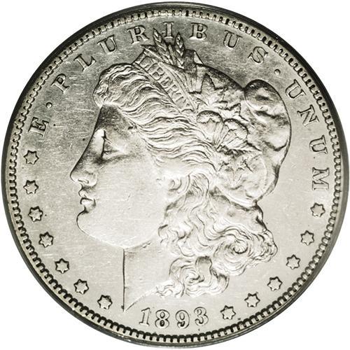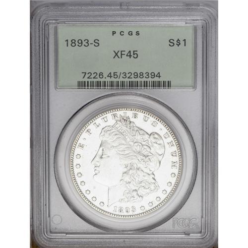 <B>1893-S<img border='0' src='http://www.heritagecoins.com/images/star.gif' width=10 height=10>$1> XF45 PCGS.</B></I> Thousands of Morgan dollar collections have begun over the years, and although most of the P-mint holes in the albums were filled with little difficulty, two formidable stoppers usually barred series completion, the proof-only 1895, and the rare, low mintage 1893-S. The demand from those many, determined collectors gradually added to the legend of these two series keys. In unimpaired grades, the 1895 is more available than the 1893-S, which is usually encountered worn. An untoned example of the 1893-S with ample remaining luster and no oppressive marks, such as the present piece, is highly coveted by collectors. Encased in a green label PCGS holder.