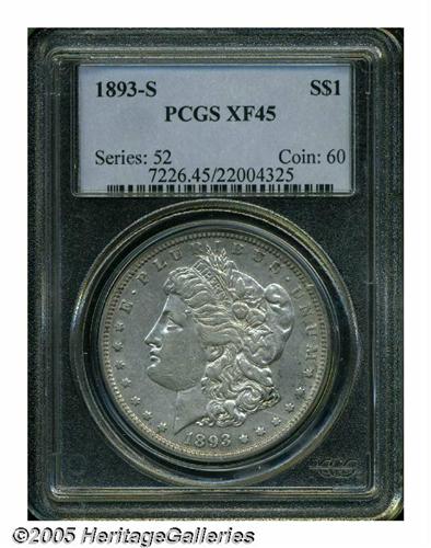 <B>1893-S<S$1> XF45 PCGS.</B></I> With an exception made for the unverified 1895, the 1893-S is the rarest issue in the entire business strike Morgan Dollar series of 1878-1921. A desirable coin at all levels of preservation, this Choice XF survivor displays a pleasingly toned sheen in medium gray hues. None of the scattered abrasions are sizeable or all that conspicuous to the naked eye, and the devices are overall bold despite light highpoint rub. A coin that should have little difficulty going to a new owner.