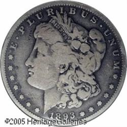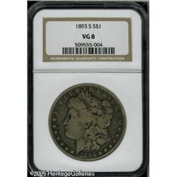 <B>1893-S<img border='0' src='http://www.heritagecoins.com/images/star.gif' width=10 height=10>$1 VG8 NGC.</B></I> A worn rose-gray example of this coveted issue. Only one surface dig is reported on the reverse between the ST of STATES and IN of IN GOD WE TRUST. The legends are all easily complete and clear of the rim, and the eagle's wings still have some feather detail. Lot:10427