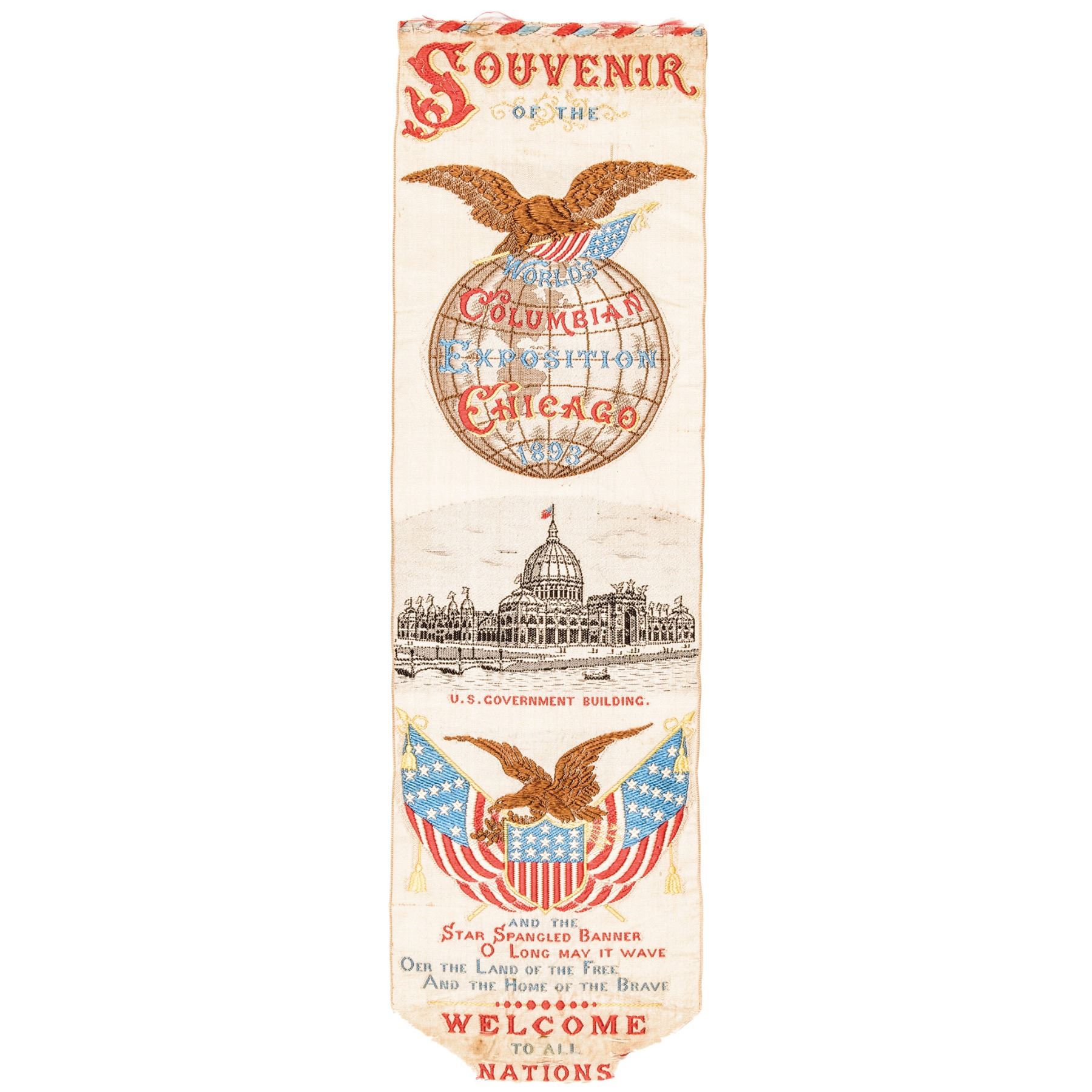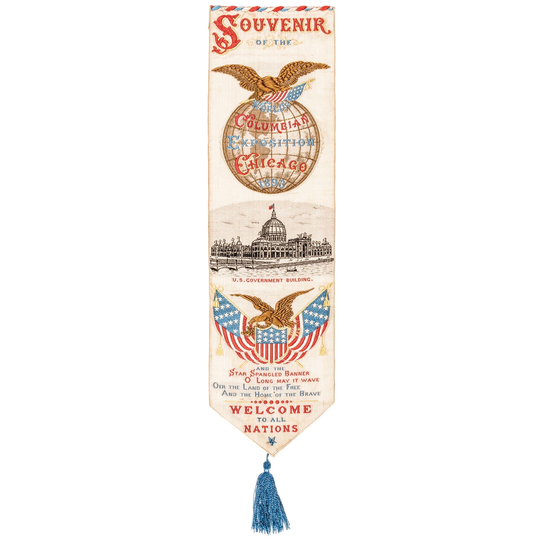 1. The first ribbon reads: “Souvenir of the World’s Colombian Exposition Chicago 1893” and features a globe with the American Heraldic Eagle at the top. Below the globe is an image of the U.S. Government Building from the fair. Below the building is another eagle with U.S. flags and additional text: “And the star Spangled Banner, O Long May It Wave, O’er the Land of the Free, And the Home of the Brave. Welcome All Nations.” Excellent condition, blue tassel still attached at the tip. Measures about 2.5” x 9” not including the extra tassel.