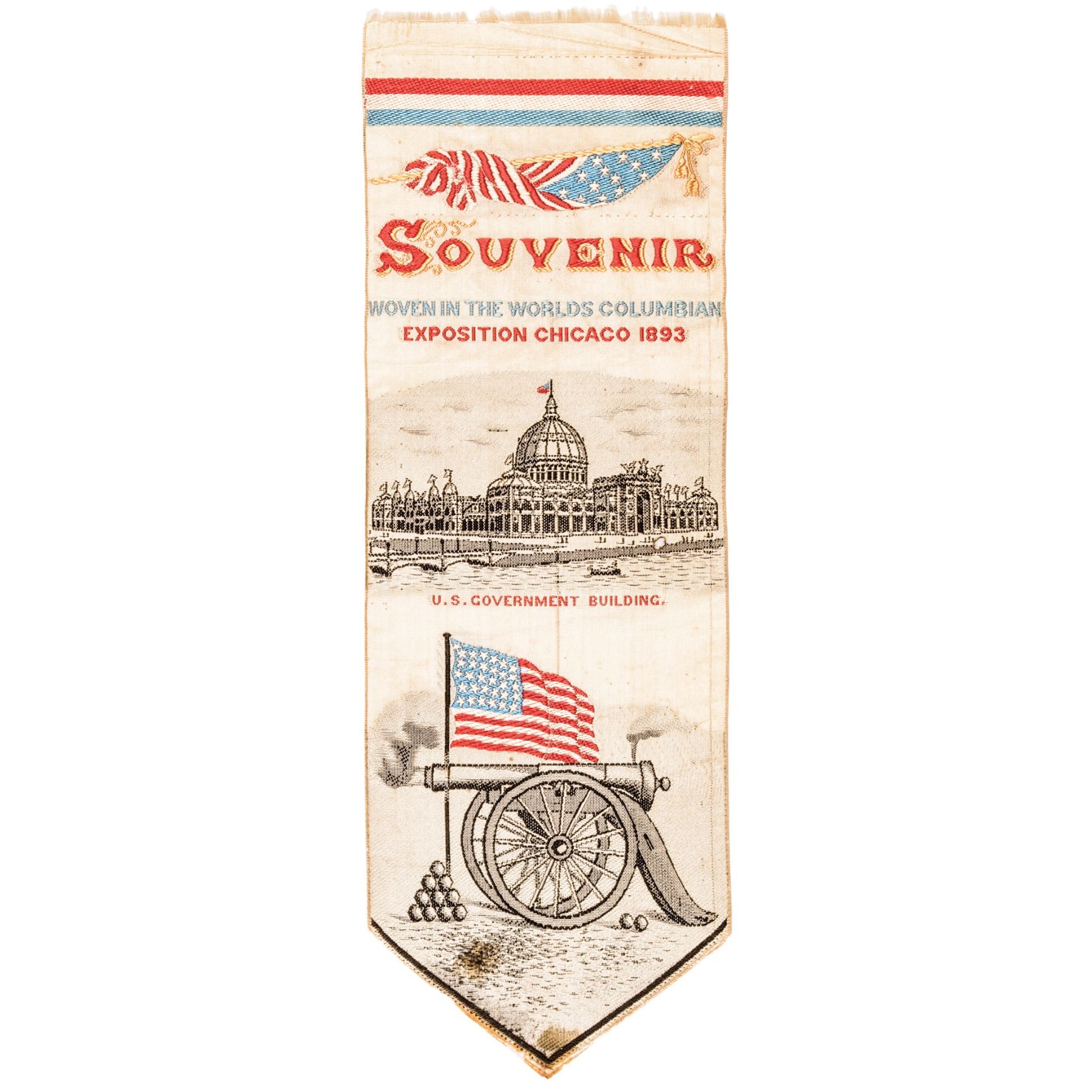3. The third ribbon shows an American Flag at the top, and below reads “Woven In The Worlds Colombian Exposition Chicago 1893.” The center of the ribbon displays the same U.S. Government Building as the other two ribbons, The bottom shows a cannon and ammunition with an American flag. Minor stains near bottom. Measures about 2.5” x 7.5”. (3 items)