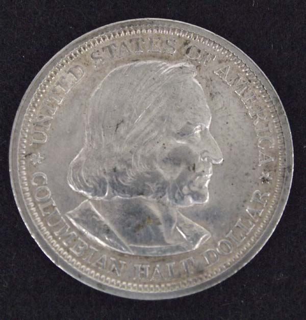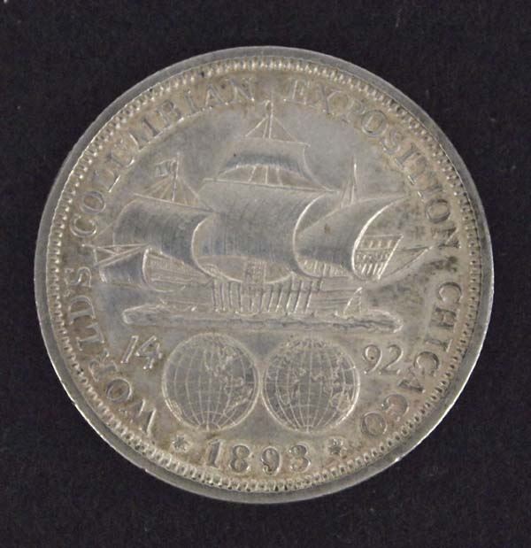 1893 U.S.A. Columbian Half Dollar Commemorative Coin: back of coin reads ''World's Columbian Exposition Chicago (1492) 1893''