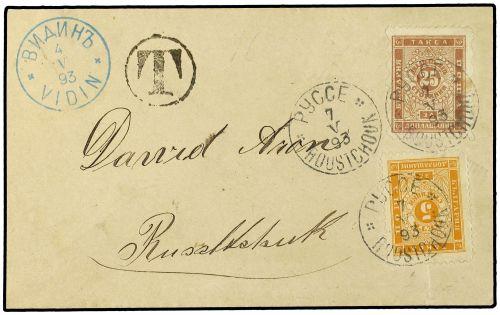1893 Unfranked envelope bearing v.fine blue VIDEN despatch date stamp. Obverse also bears large circular-framed ´T´ +5st. + 25st postage due cancelled on arrival at ROUSTCHOUK.