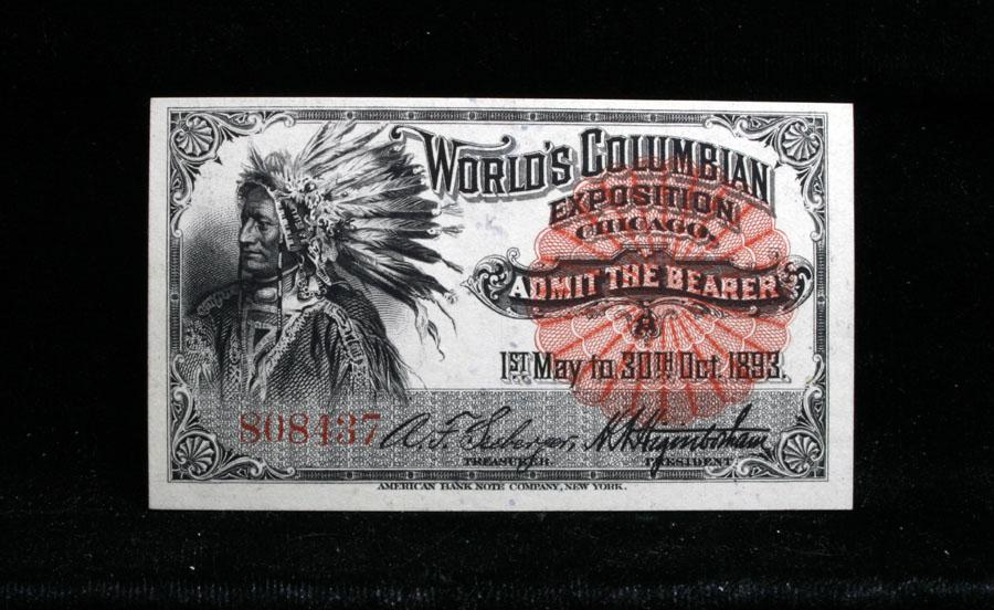 Gem CU 68, Near Perfect example of the "Indian" Ticket. This is one of the Keys to the series, very scarce. Many of these have been counterfeited. A good way to detect counterfeits is the lack of bluish ink dots on the reverse border, generally on the long side and near the center. This was technically a printing "error" but is on virtually all authentic examples. I have never seen an authentic one without it. It is this "Error" that is generally missing on counterfeits. This example would be a great piece to send in for grading. Sharp corners, great edges. A great piece of Americana, printed by the American bank Note Company. Estimated Value $200