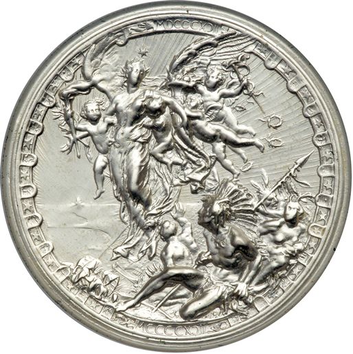 1893 World's Columbian Exposition, Memento of The World's Fair. Eglit-105. NGC Uncirculated Details. White metal, 59mm. Obverse: Columbus bust 1/4 to left, legend Memento of the World's Fair, Chicago 1893. Reverse: Floating figure of "Civilization" surrounded by Genii above Indians with American shoreline in background.