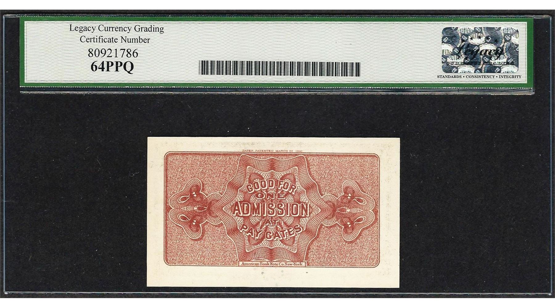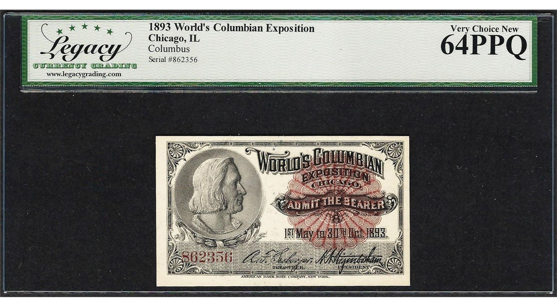 One 1893 World's Columbian Exposition Ticket Columbus Legacy Very Choice New 64PPQ. Legacy Graded.