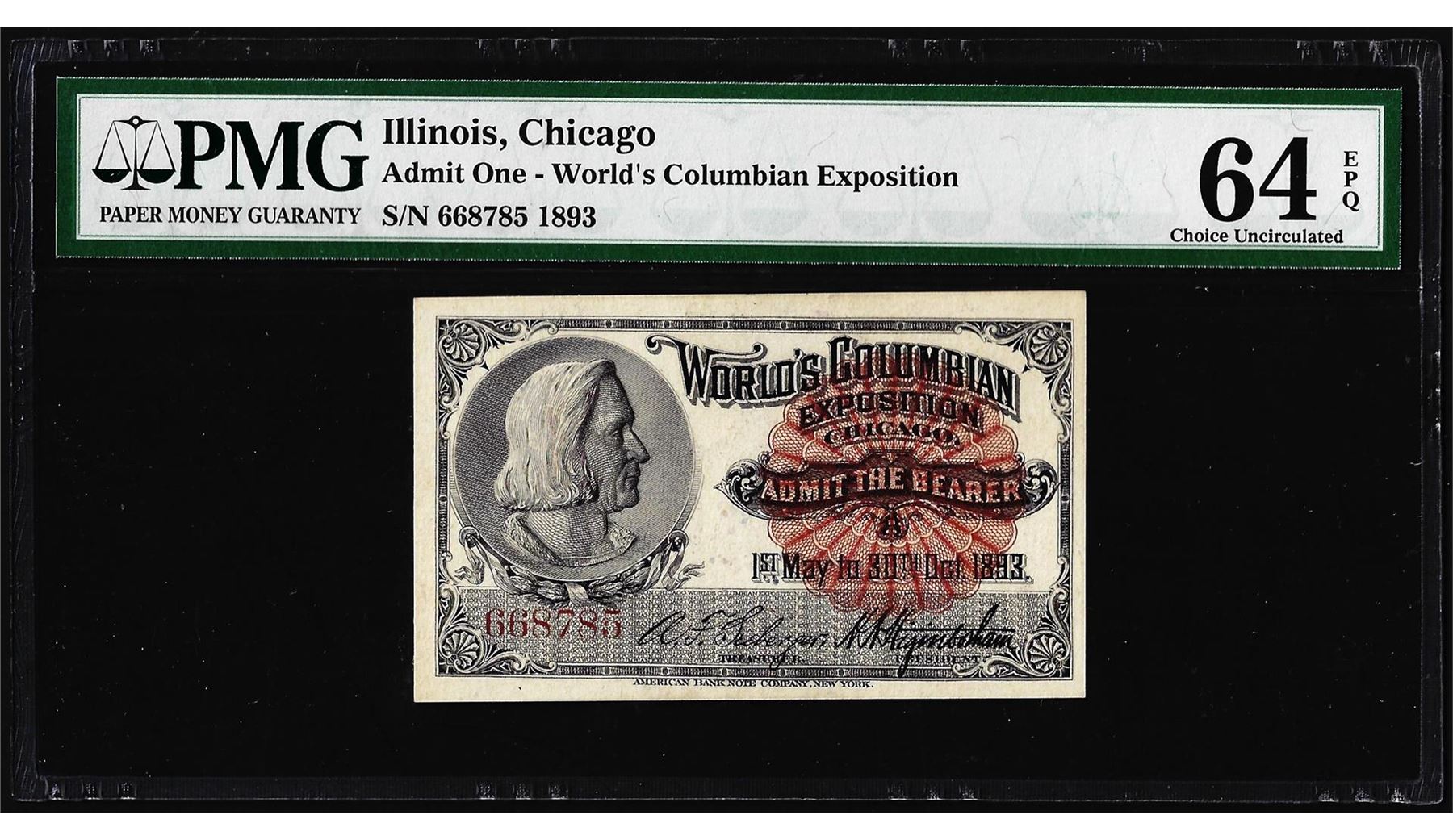 One 1893 World's Columbian Exposition Ticket Columbus PMG Choice Uncirculated 64EPQ. PMG Certified.
