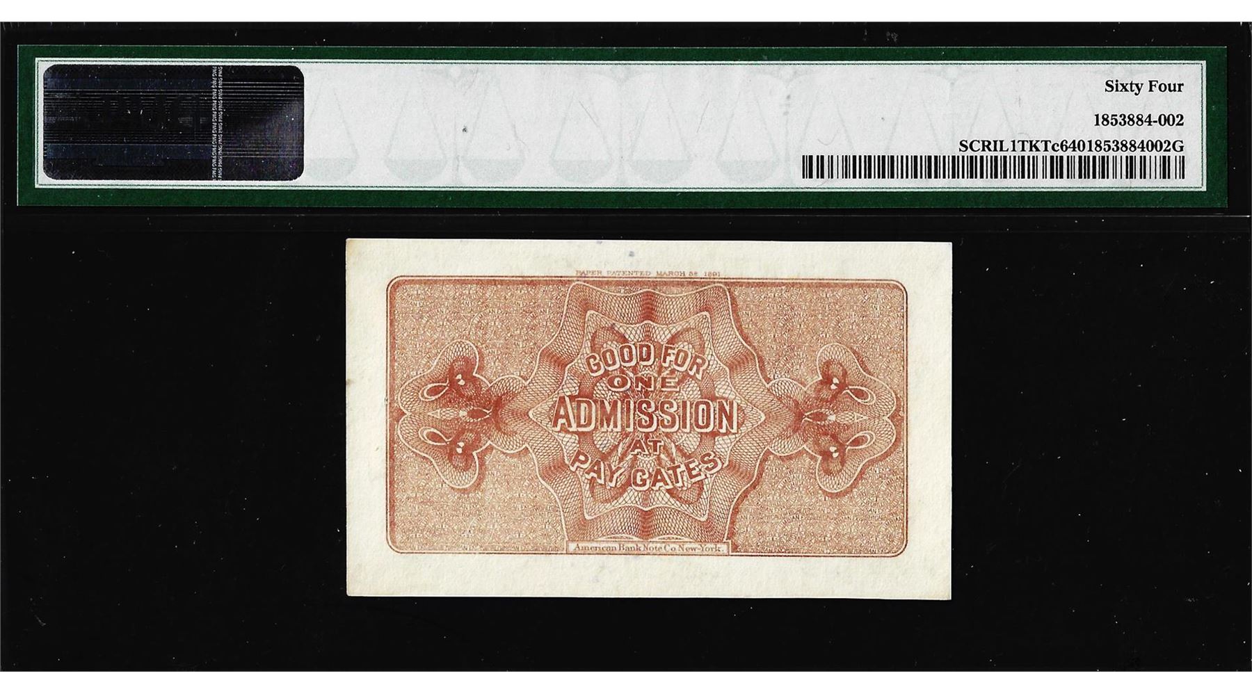 One 1893 World's Columbian Exposition Ticket Columbus PMG Choice Uncirculated 64. PMG Certified.