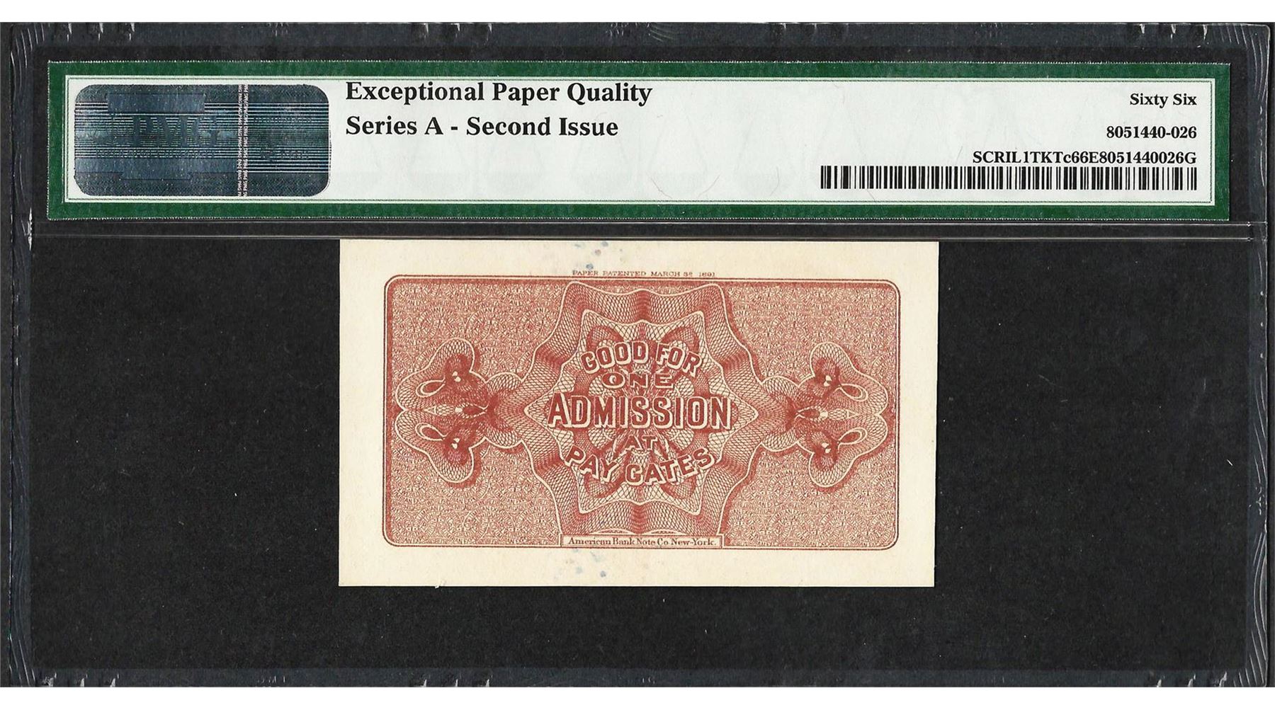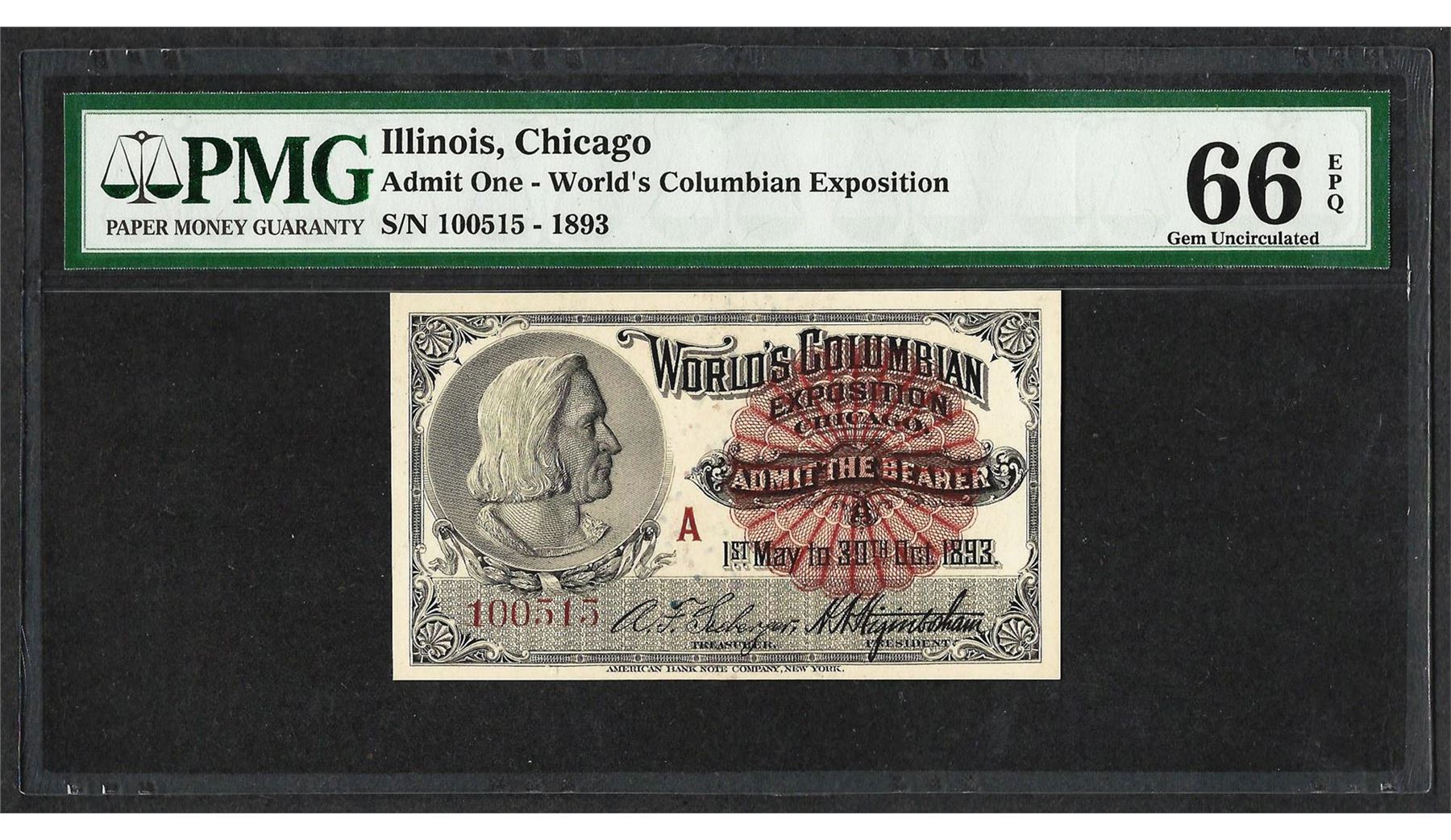 One 1893 World's Columbian Exposition Ticket Columbus PMG Gem Uncirculated 66EPQ. PMG Certified.