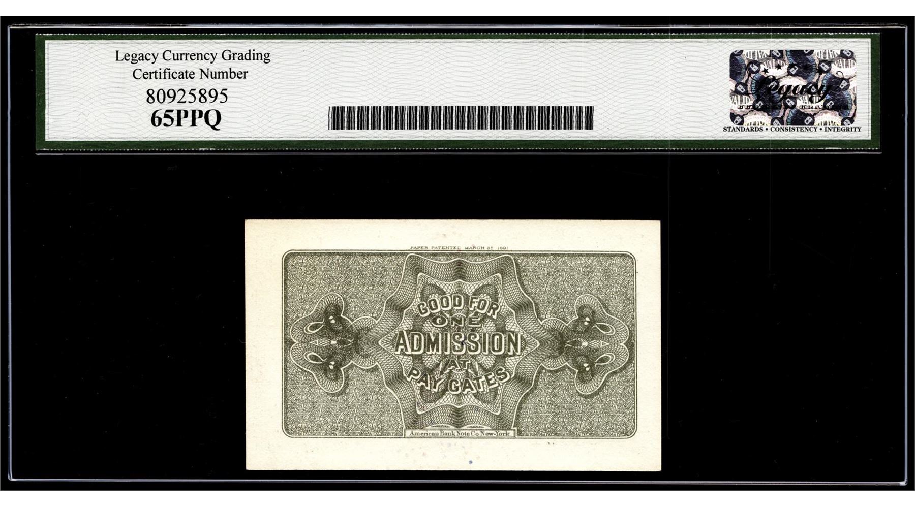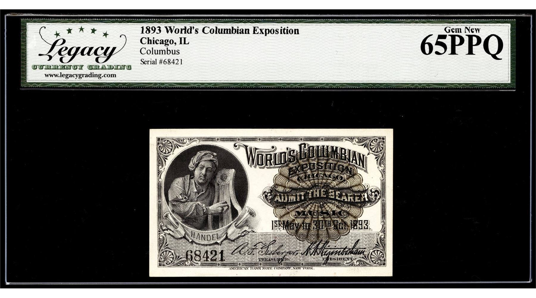 One 1893 World's Columbian Exposition Ticket Handel Chicago Legacy Gem New 65PPQ. Legacy Graded.