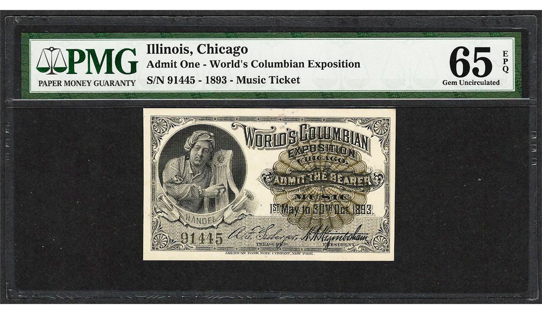 1893 World's Columbian Exposition Ticket Handel PMG Gem Uncirculated 65EPQ