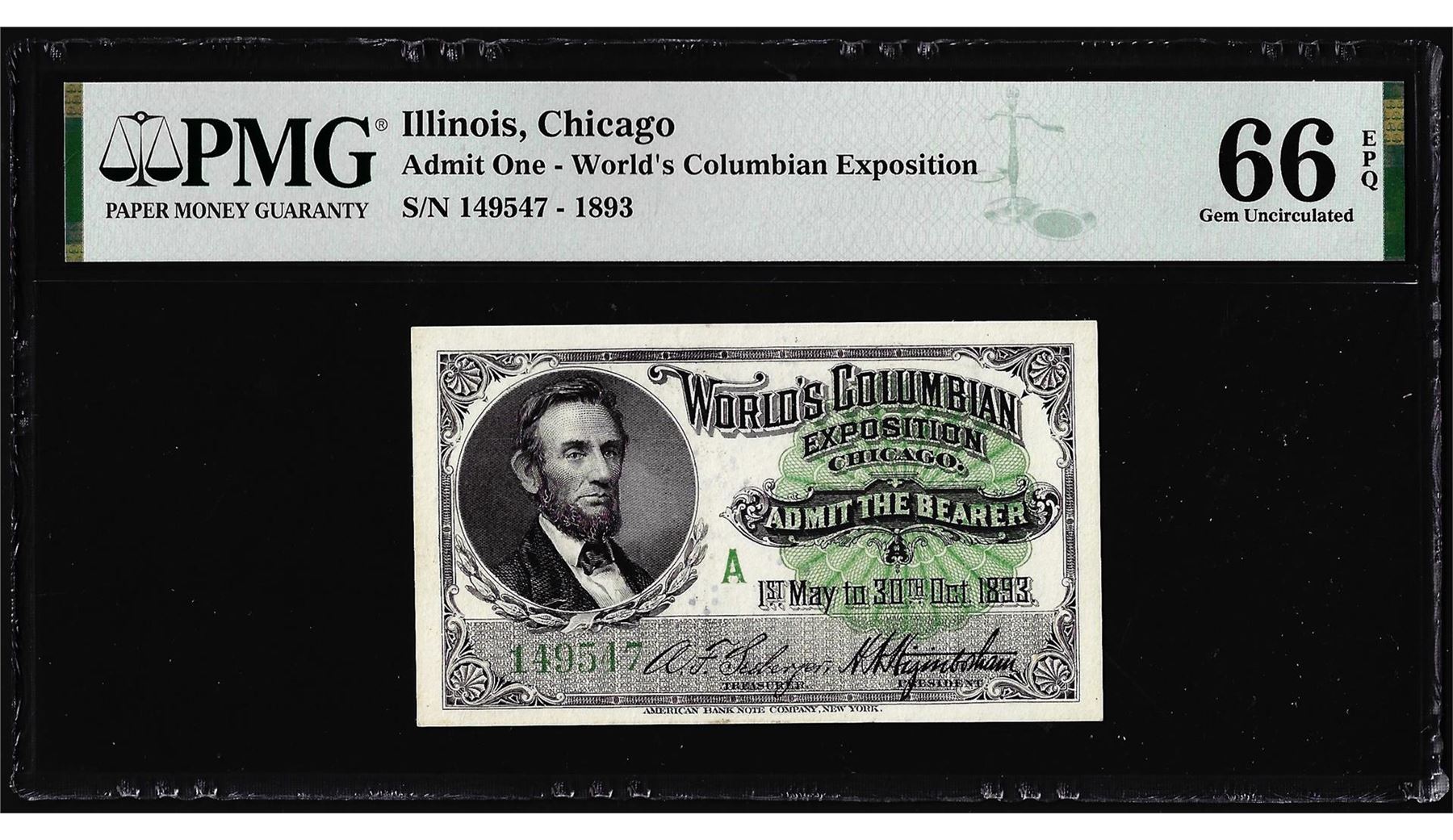 One 1893 World's Columbian Exposition Ticket Lincoln PMG Gem Uncirculated 66EPQ. PMG Certified.