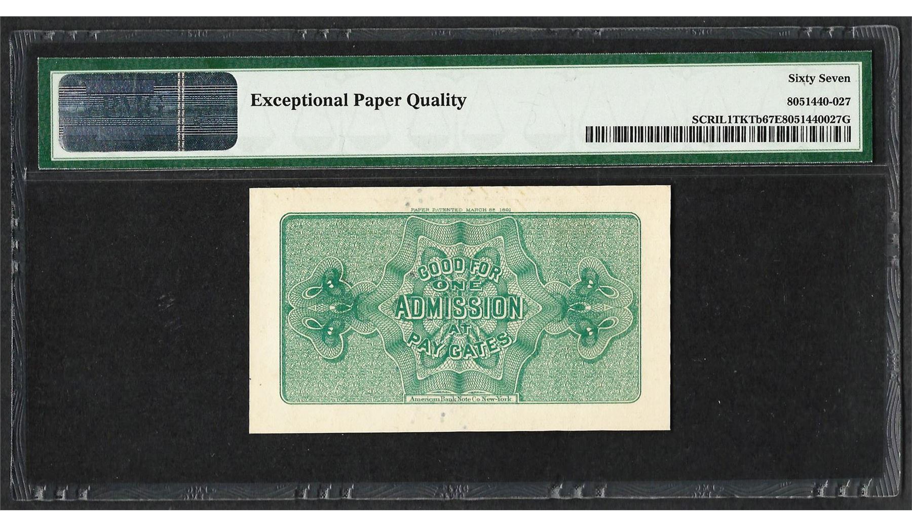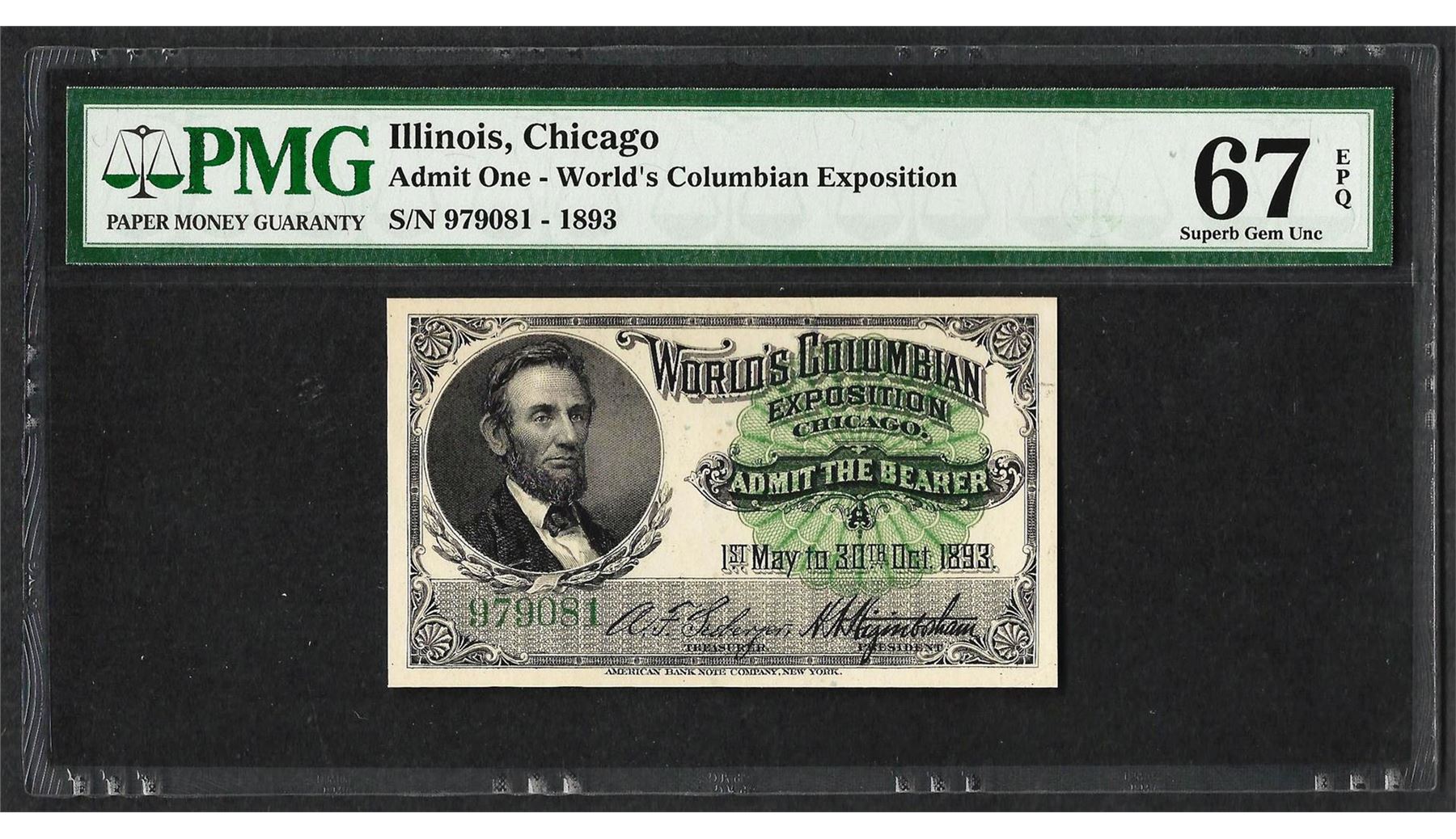 One 1893 World's Columbian Exposition Ticket Lincoln PMG Superb Gem Uncirculated 67EPQ. PMG Certified.