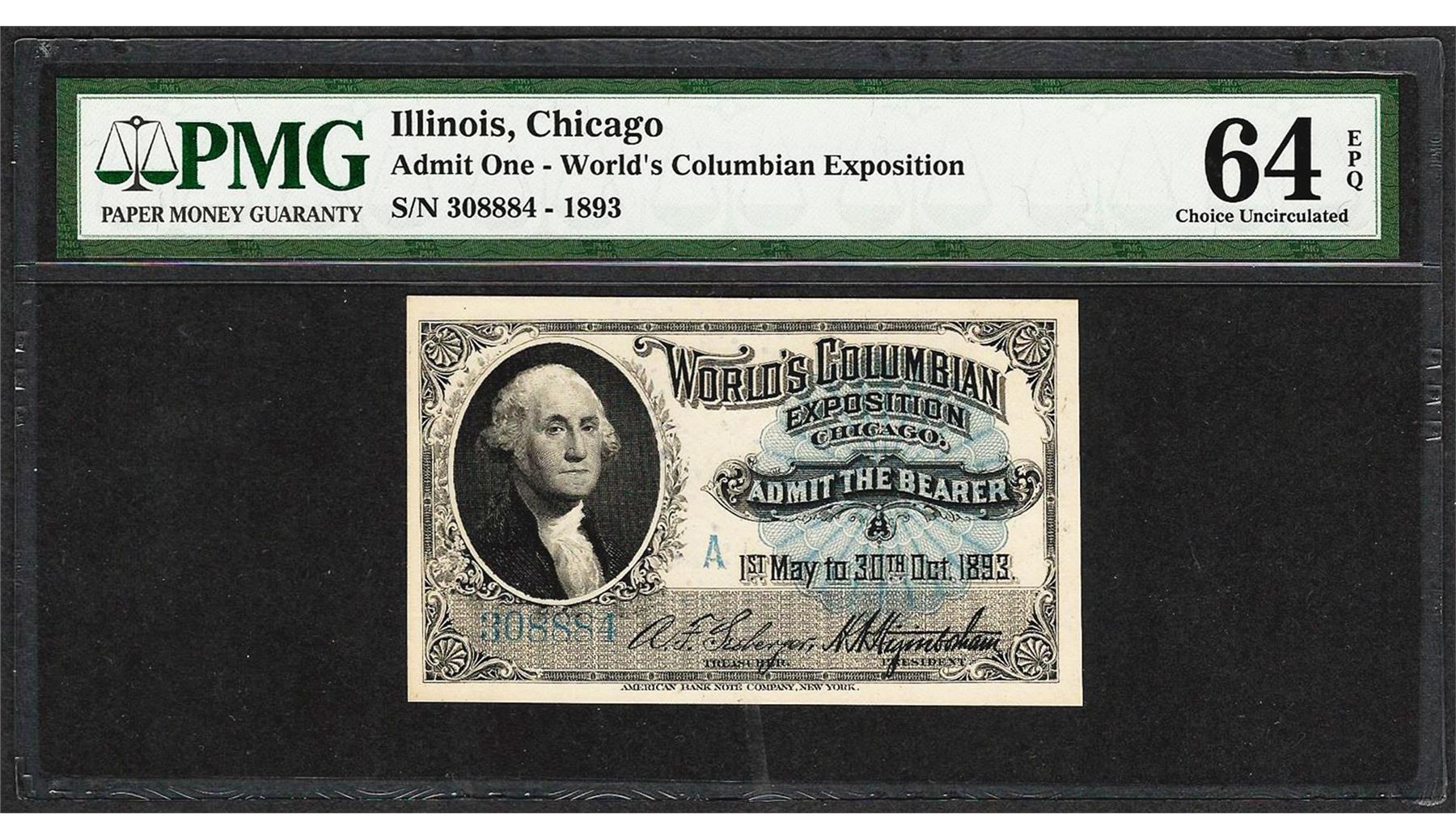 One 1893 World's Columbian Exposition Ticket Washington PMG Choice Uncirculated 64EPQ. PMG Certified.