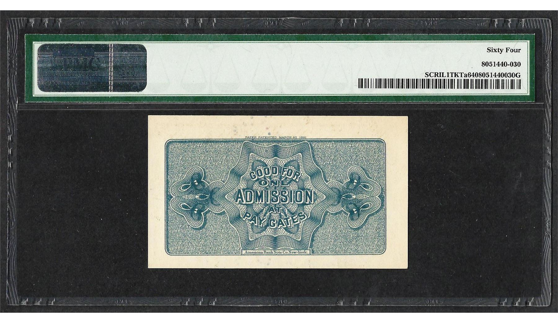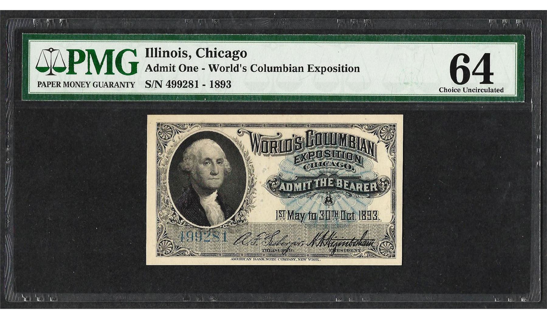 One 1893 World's Columbian Exposition Ticket Washington PMG Choice Uncirculated 64. PMG Certified.