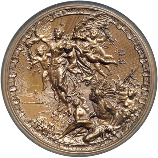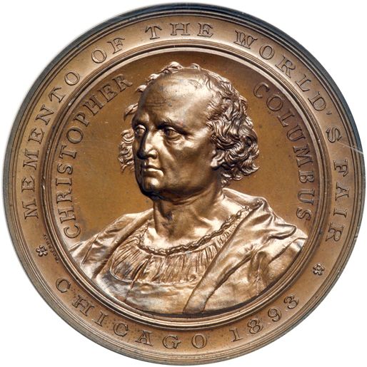 1893 World's Columbian Expostion, Memento of the World's Fair Medal. Eglit-105. NGC MS-65. NGC graded MS-65. Bronze, 59mm. Designed by Pagliaghi, engraved by Capuccio and struck in Milan, Italy. Columbus bust on obverse and figure of "Civilization" surrounded by Genii floating above Indians with American shoreline in background. This is an superb example of this milk chocolate brown, high relief medal.