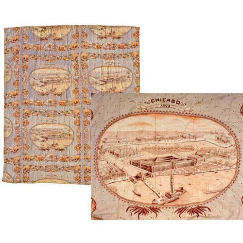 <Our item number 141032><B>1893 Worlds Fair Quilt With Portraits of Famous Inventors.</B> Columbian Exposition quilt, decorated on both sides with portraits of famous inventors and scenes from the fair, made for Cochrane's Turkey Red Works, 8 feet x 6½ feet, decorated with an ornate, brown and orange print on both sides, depicting George Washington and 3 famous inventors, and scenes at the Fair. This print, repeated 4 times on each side, has a bird's-eye view of the fairgrounds, looking inward from the shore of Lake Michigan, surrounded by smaller scenes and portraits of George Washington, Samuel F.B. Morse (inventor of the telegraph), George Stephenson (inventor of the locomotive), and Robert Fulton (inventor of the steamboat). This whole designed is labeled, "Souvenir World's Columbian Exposition Chicago 1893." Hidden in the design near Stephenson's portrait is an advertisement for "Cochrane's Turkey Red Works, Malden, Mass." Founded by Alex ander Cochrane in the late 1850s, the Cochrane Chemical Works (also known as the Malden Chemical Company) produced Turkey Red dye for textiles. This quilt must have been made for the Cochrane company, which, likely had an exhibit at the Fair. One side of the quilt offered here has a dark red border around the edges, no doubt colored with Turkey Red Dye. Excellent condition, with some scattered light soiling. <BR>Estimated Value $1,000 - 1,500. <BR><BR>Our item number 141032<BR><IMAGES><P ALIGN="CENTER"><IMG SRC="http://www.goldbergcoins.net/liveauction/49jpegs/141032.jpg"> </P></IMAGES>
