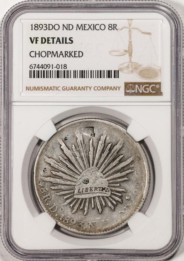 One 1893DO ND Mexico 8 Reales Silver Coin NGC VF Details Chopmarked. NGC Certified.